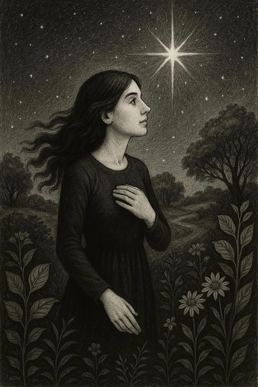 Eine Mondsichel, sie zeichnet eine Rippe in das Dunkel der Nacht. Diese Rippe gehört einer Frau. Eva könnte sie heißen, oder Isa, oder einfach die Frau. Nackt, von wallendem Haar beschützt, streift sie sinnlich berührend alles Gewächs und dessen Blüten, durch mein Träumen. Sie weiß nicht, wo sie ist, nimmt des Atems beraubt wahr, was ihre Sinne an Kostbarkeiten einfangen. Warmes Licht wird zum Spiegel der Morgenstunde und die Sonne balanciert auf dem Zeigefinger des staunenden Wesens. Behutsam nähert es sich den Pflanzen und Tieren, die sich, von welchen Mächten auch immer geleitet, ineinander fügen.